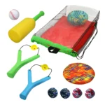 - Includes two 5.25” W x 7.88” H plastic sling shots and four 2” diameter mini splash balls